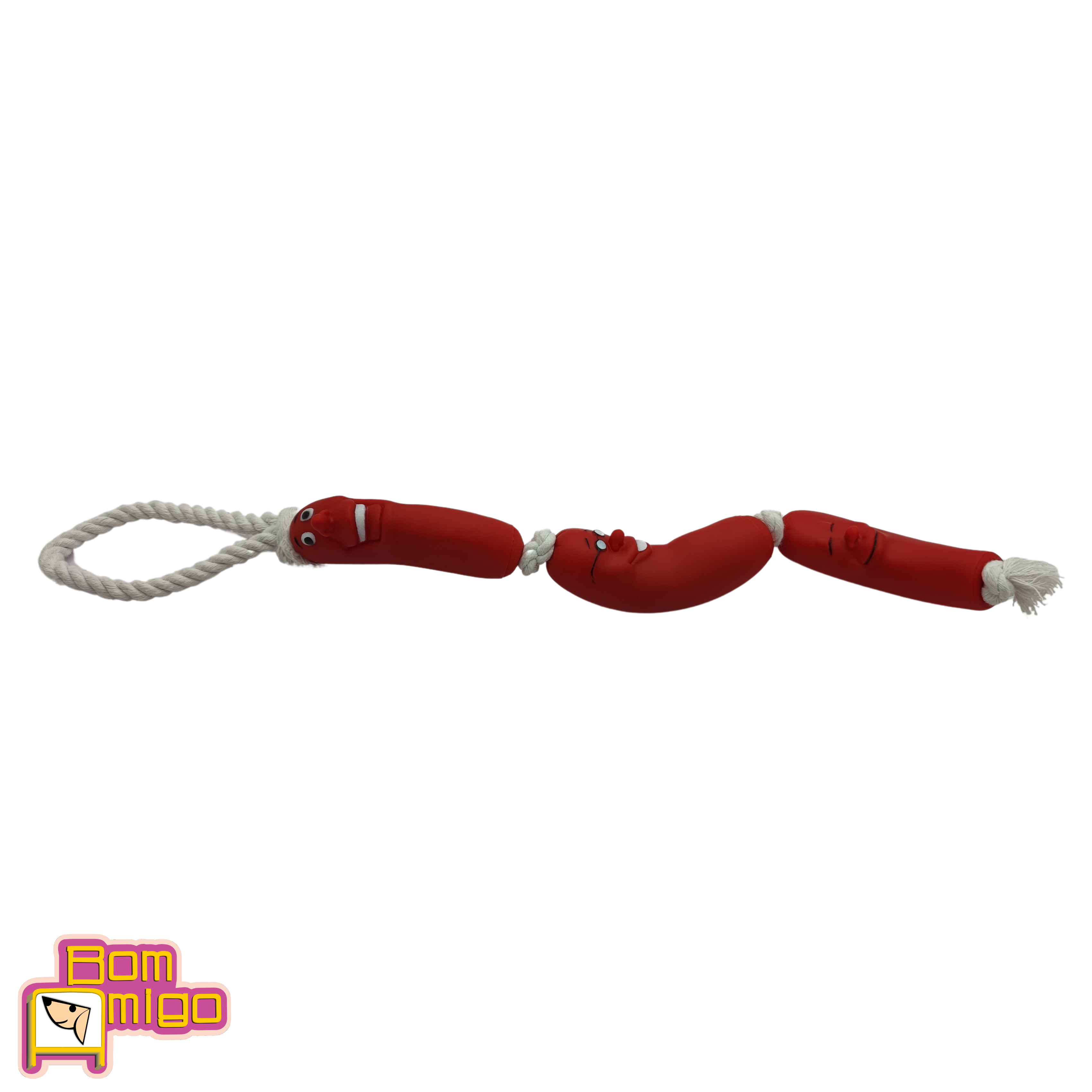 De vinil e corda, nas medidas 50 x 4 cm e 86g de pura suculência em formato de Salsicha, esse brinquedo de morder é a delicia que seu cão precisa.