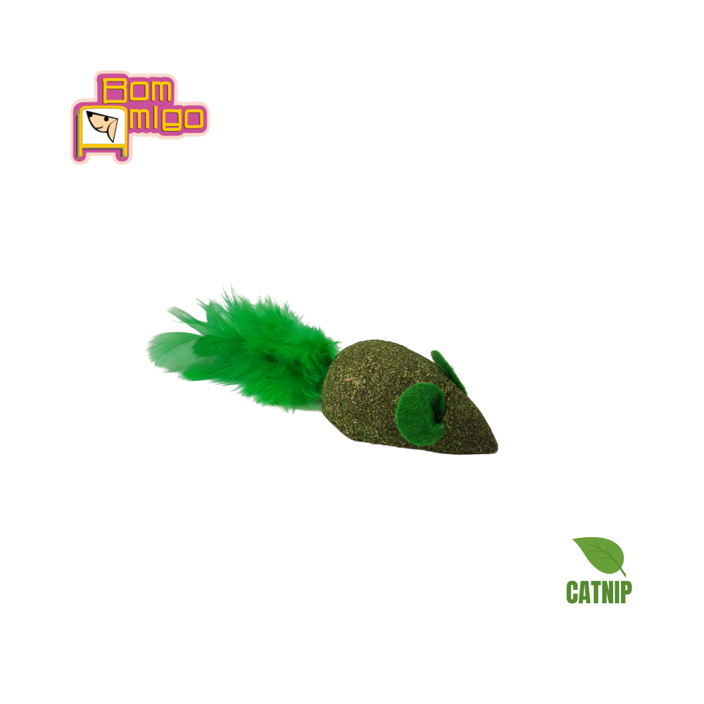 CAT HAPPYNIP é um ratinho com rabo de pluma verde que mede 10x2x2 cm e pesa 28g
